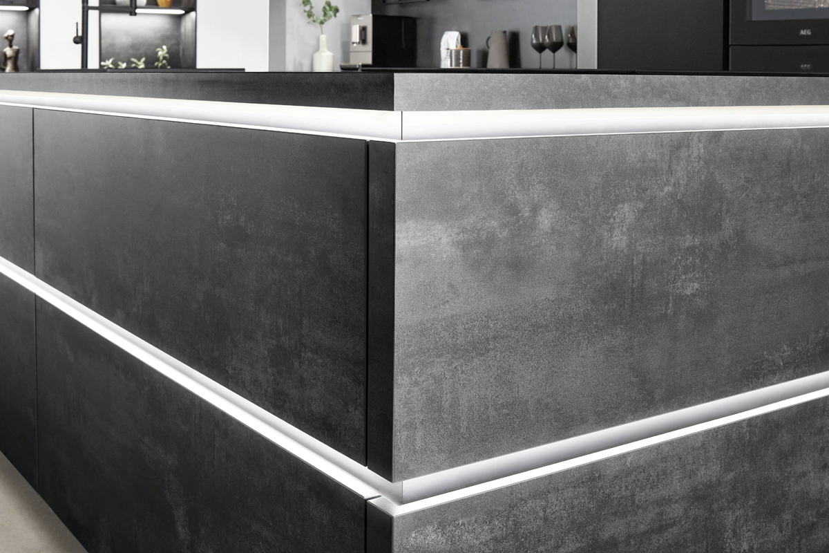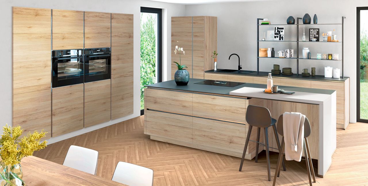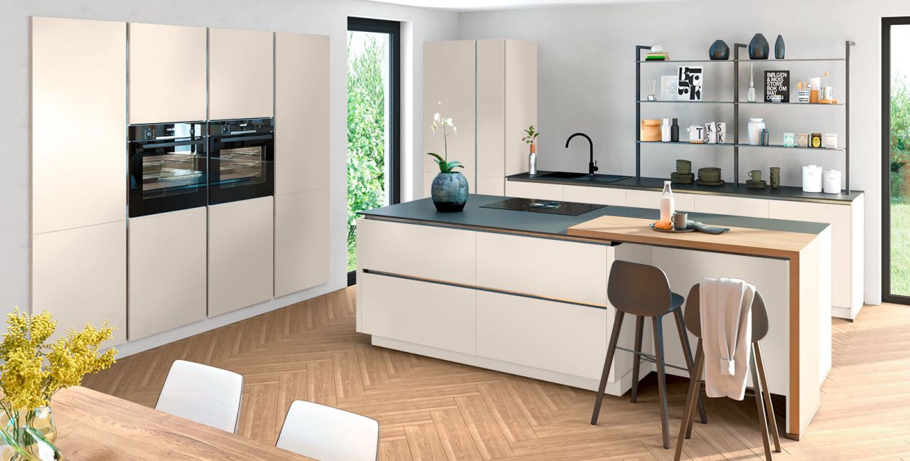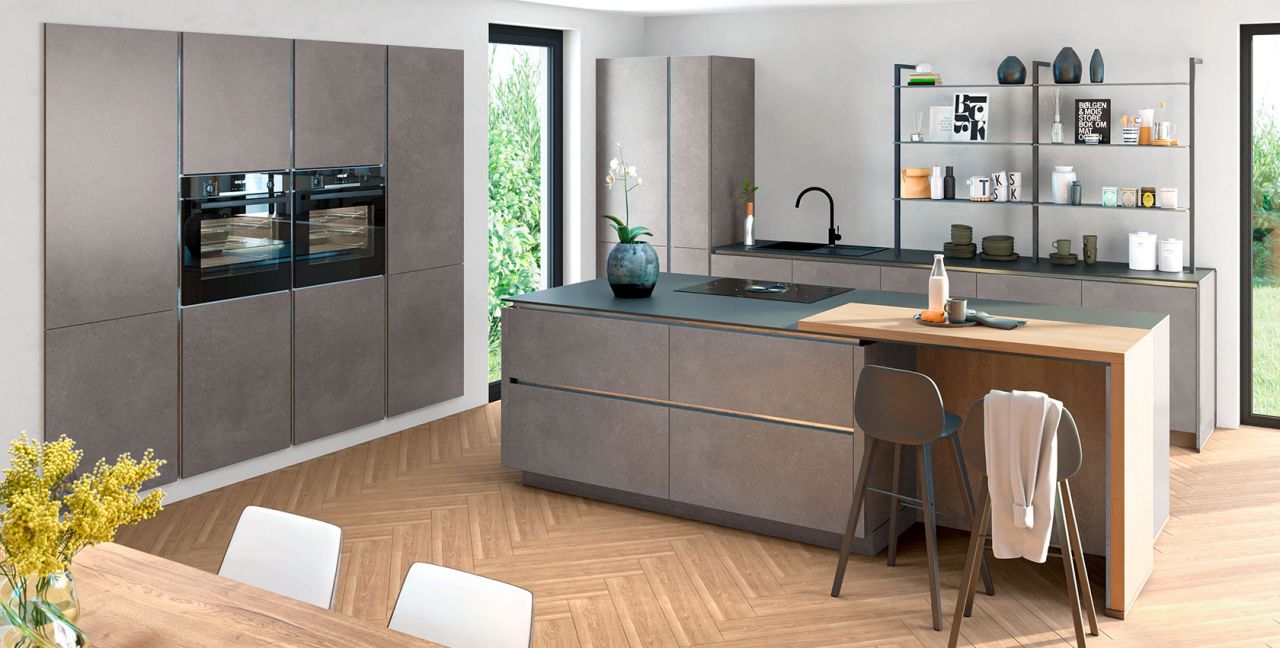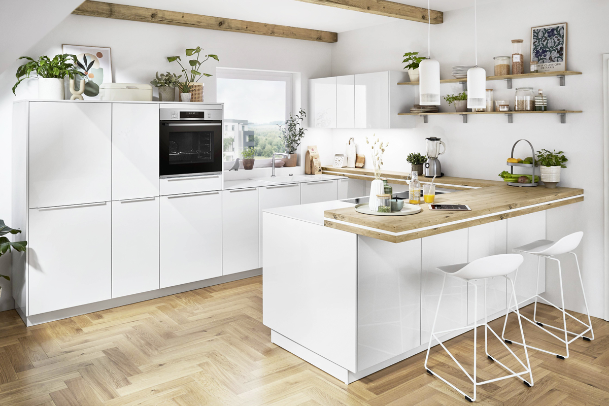 Inclusief 2x inbouwoven zwart Bosch HBG5780B6 Energieklasse A, keramische kookplaat met inductie en werkbladafzuiging (circulatielucht) Bora GP4U, koelkast Progress PK0814 Energieklasse E, volledig geïntegreerde vaatwasmachine Progress PV1548 Energieklasse E, inbouw-designspoelbak Elleci Logik 300, XL-kasten, onderkasten met grote laden, plankenreksysteem, eetbar.